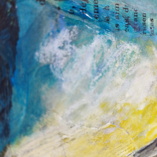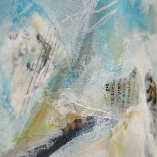 I made this collection by series of 4 pieces at the same time.I loved this process, which was like a meditation. I placed and glued torn paper, pieces of text and torn colored paper. I glued these little worlds together and then let the ink and pastels, the acrylic juice and the doodles go.