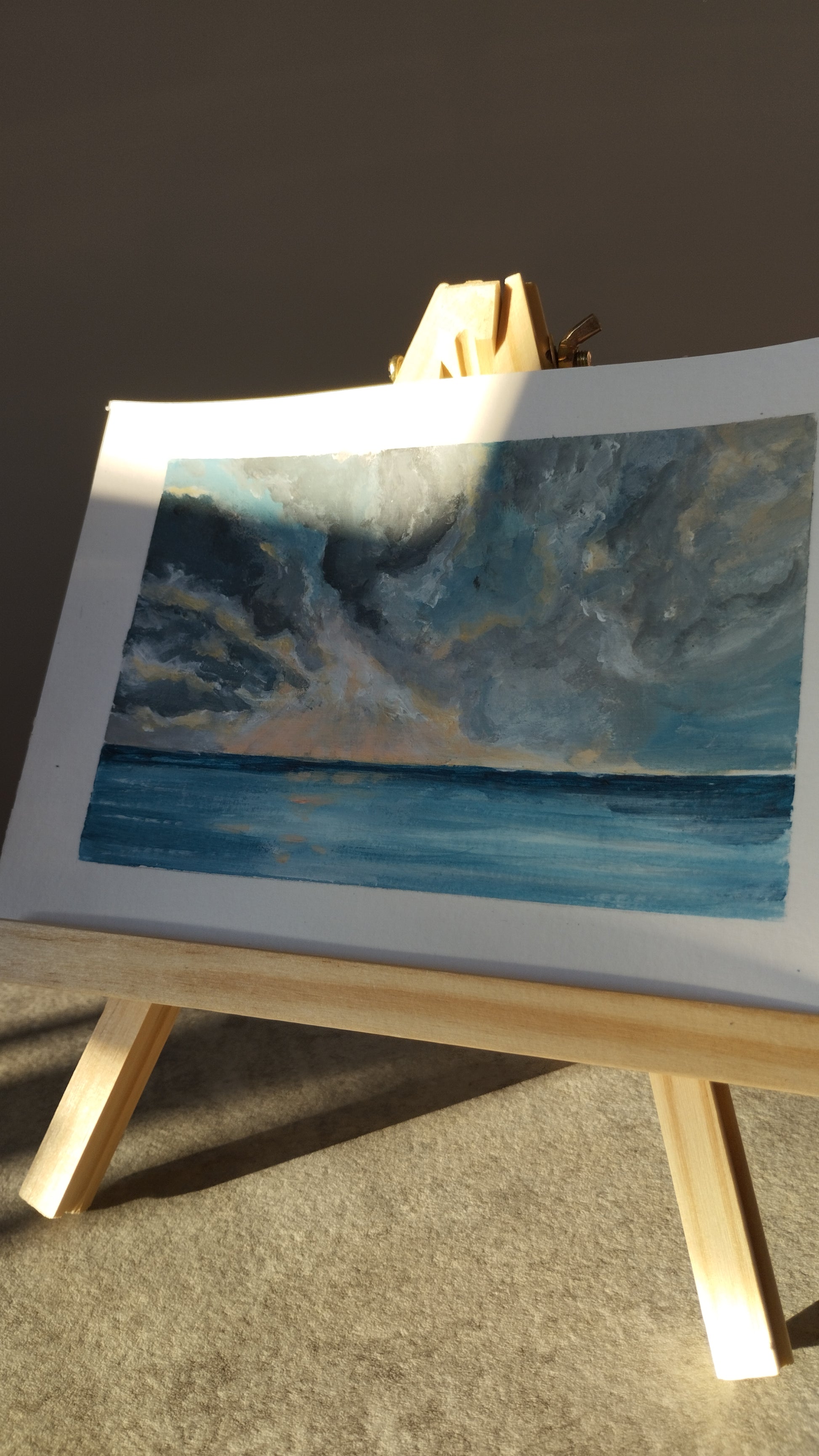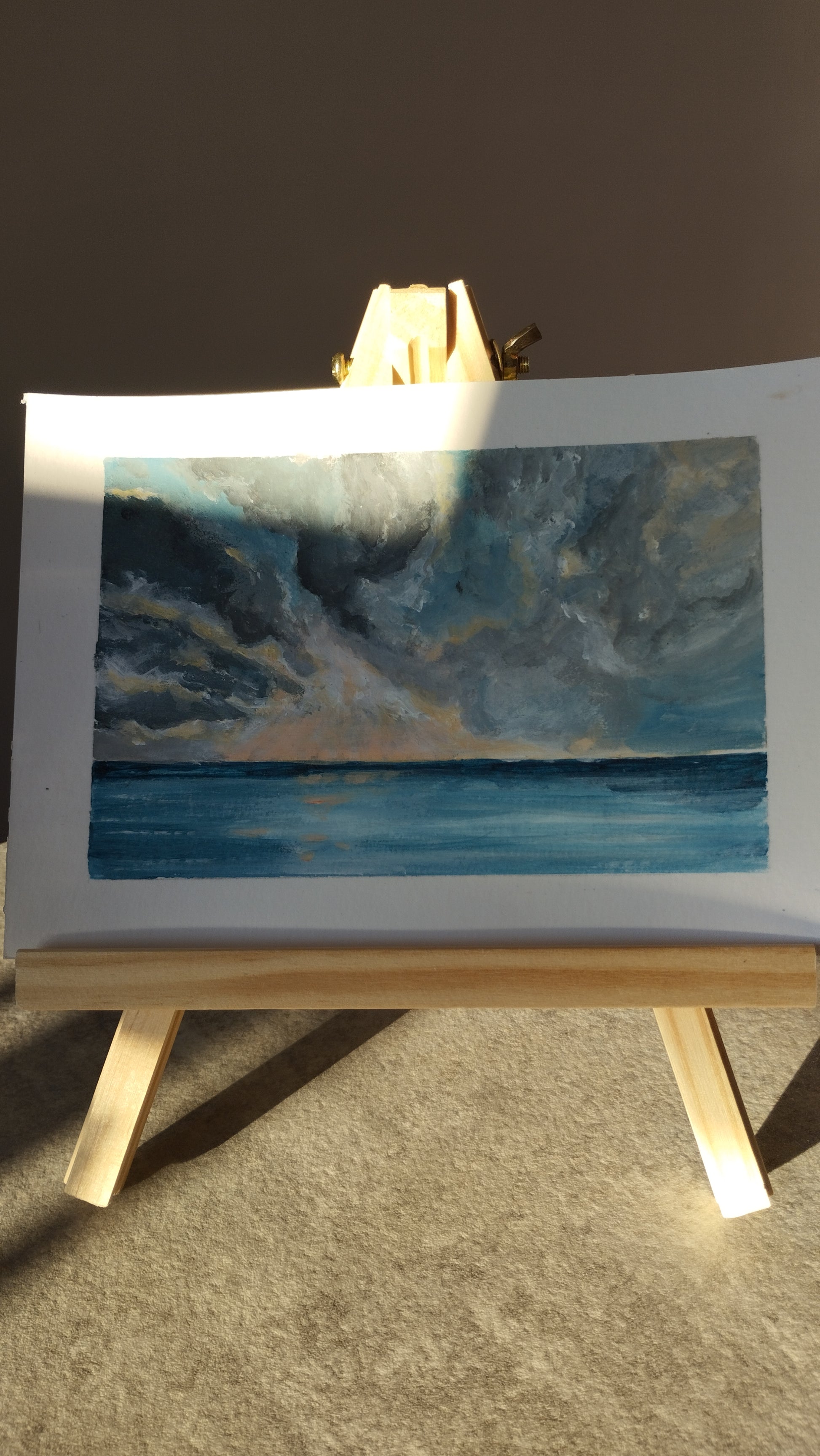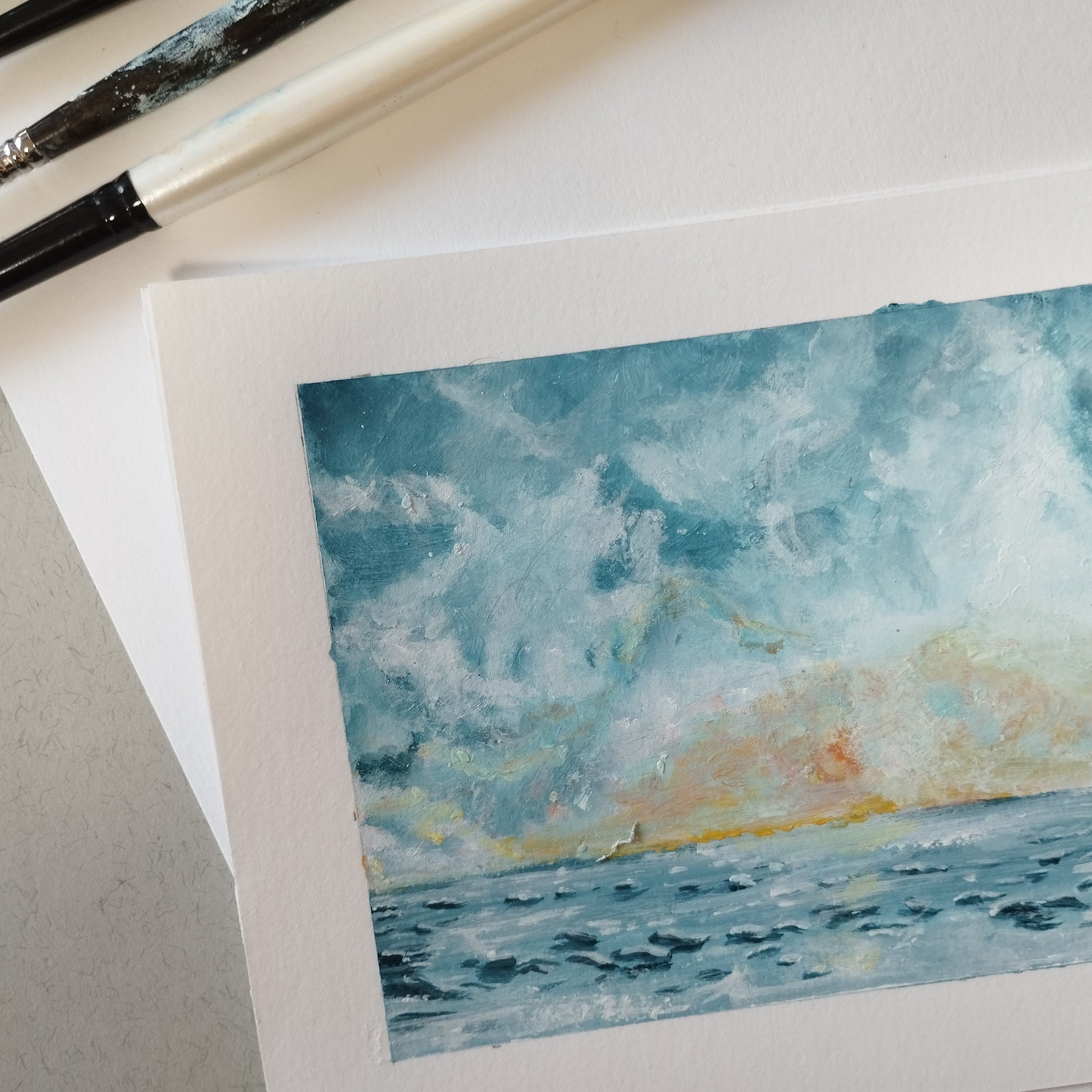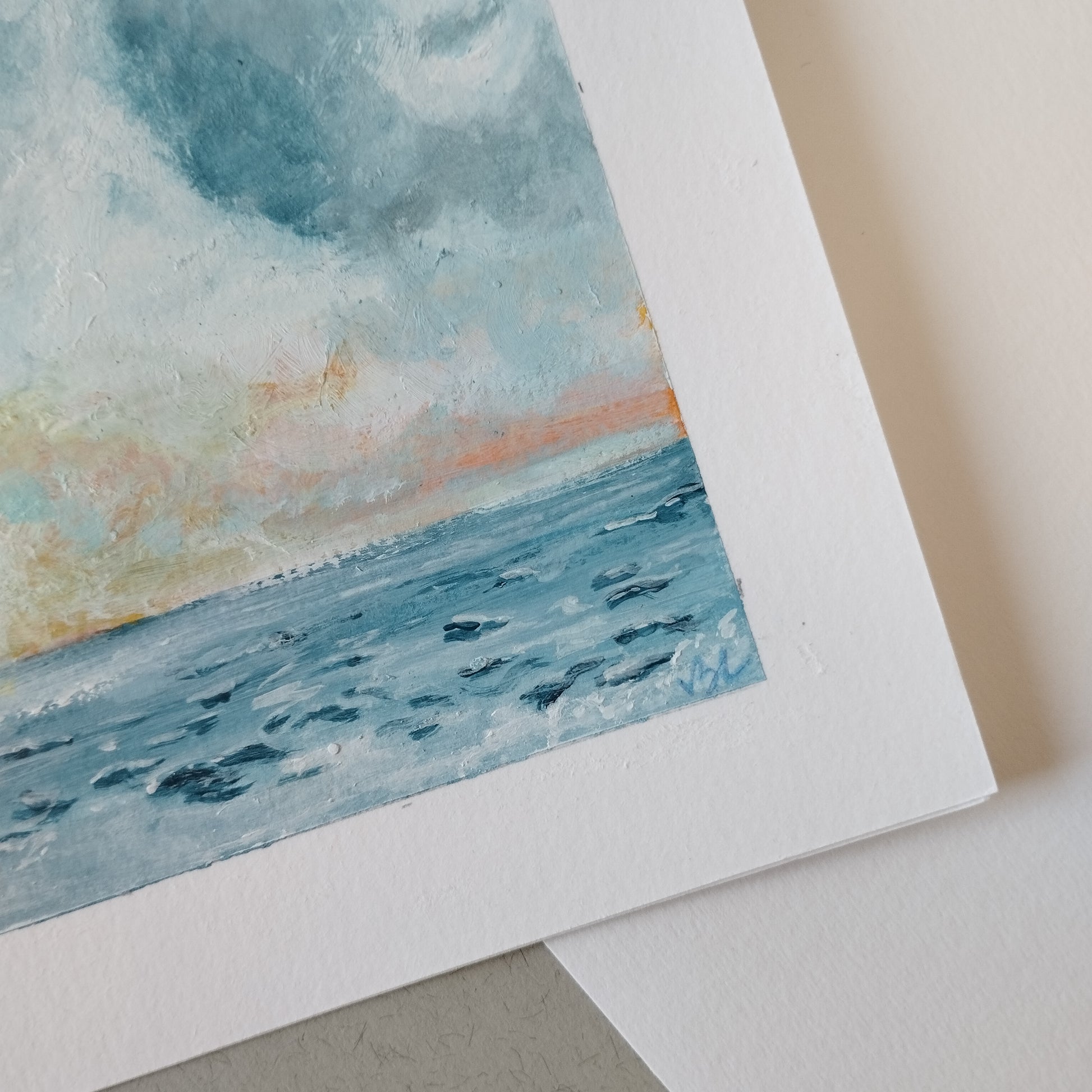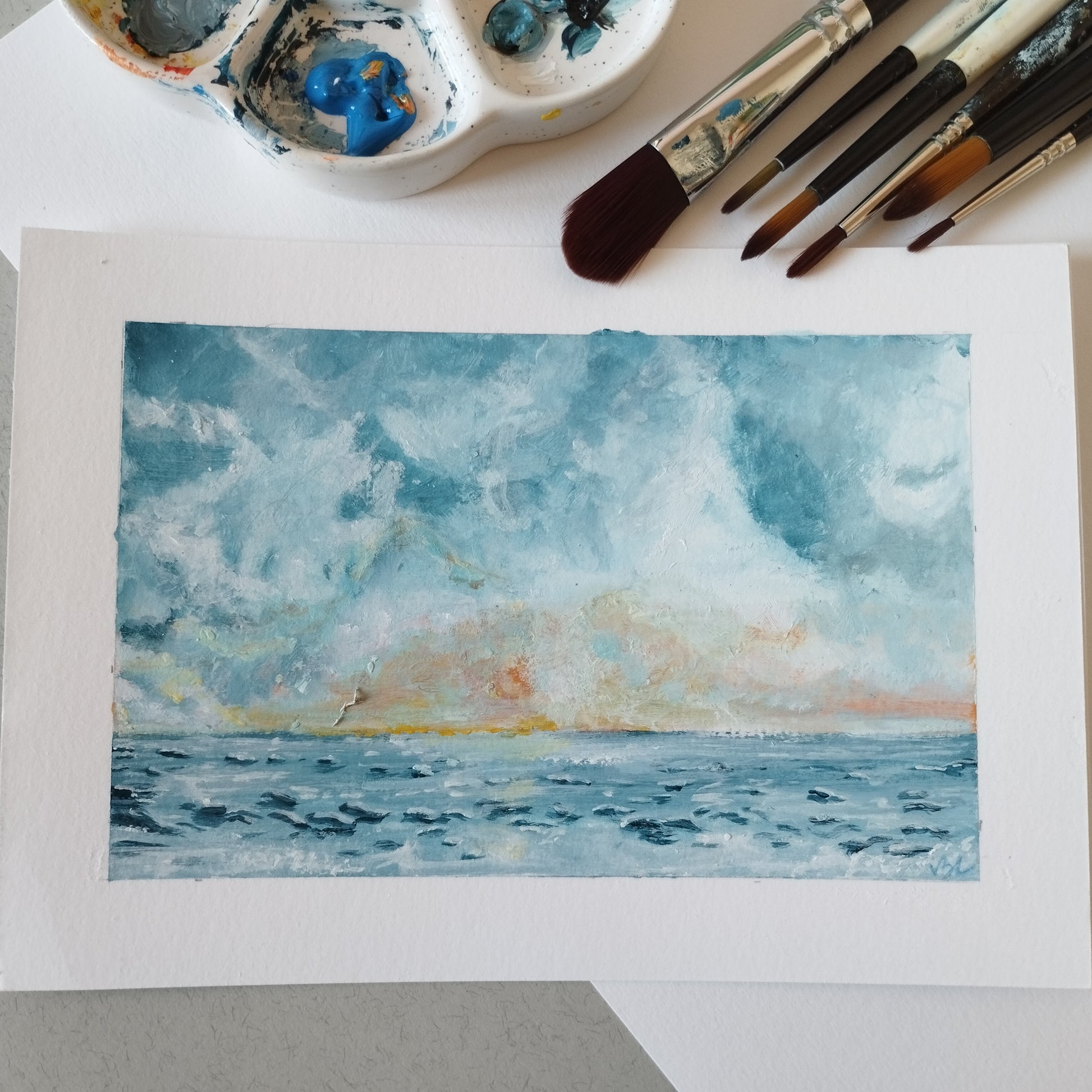 This seascape is an original acrylic artwork painted on watercolor paper 300 g. Sheet size A5 14,5 x 21 cm or 5,8 x 8.3 in, painting size 11 x 17 cm or 4,4 x6.7 in.