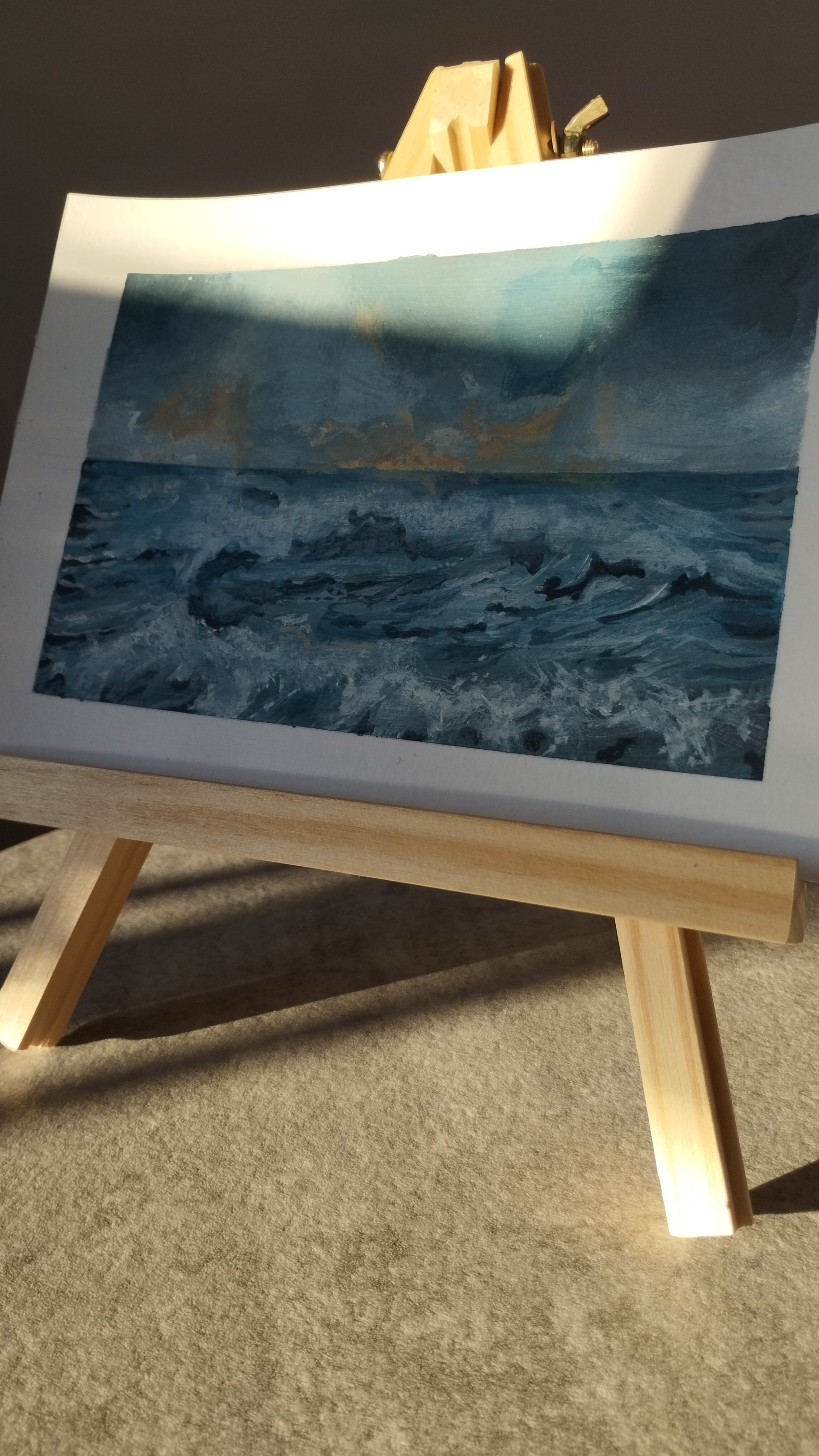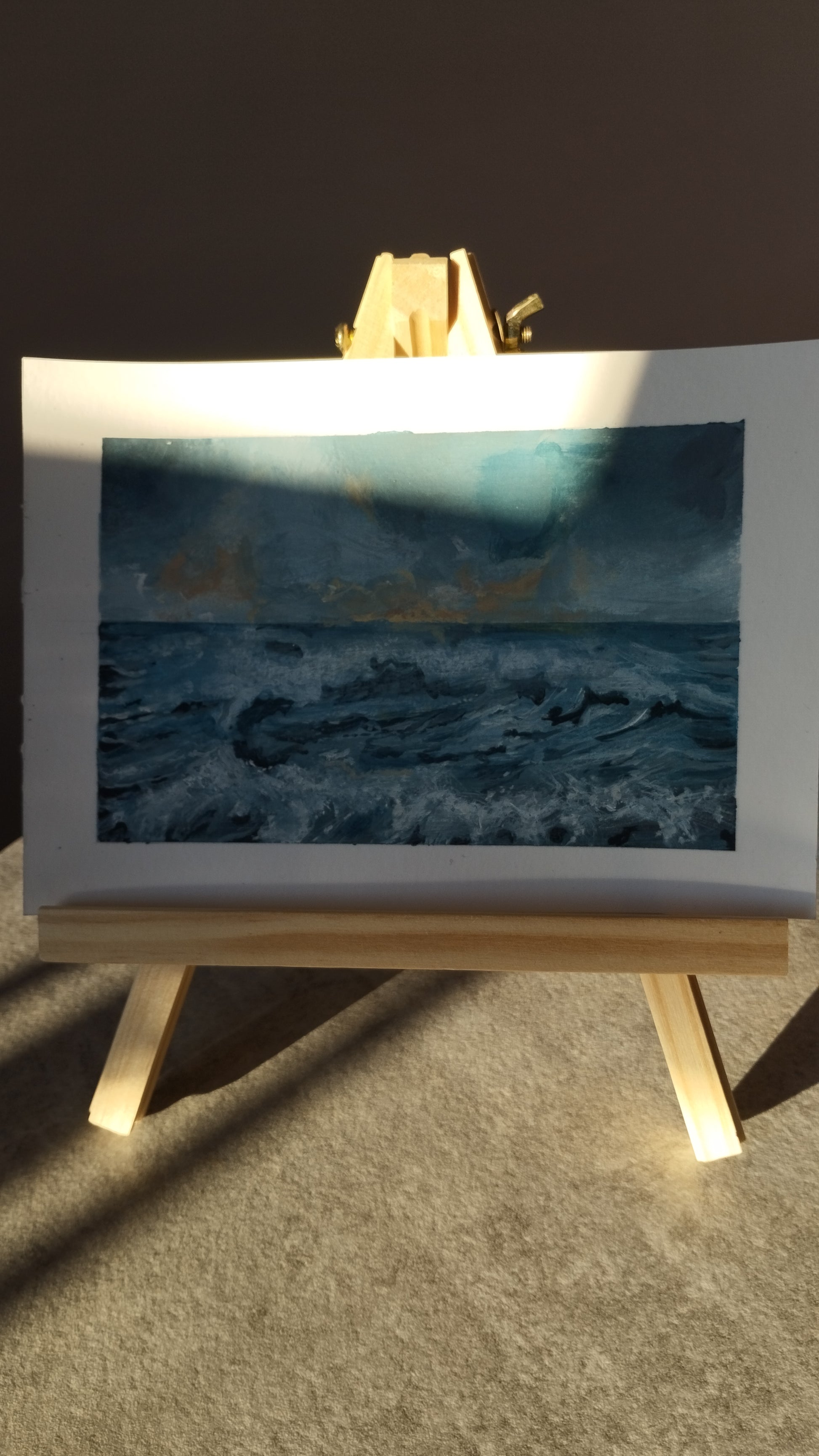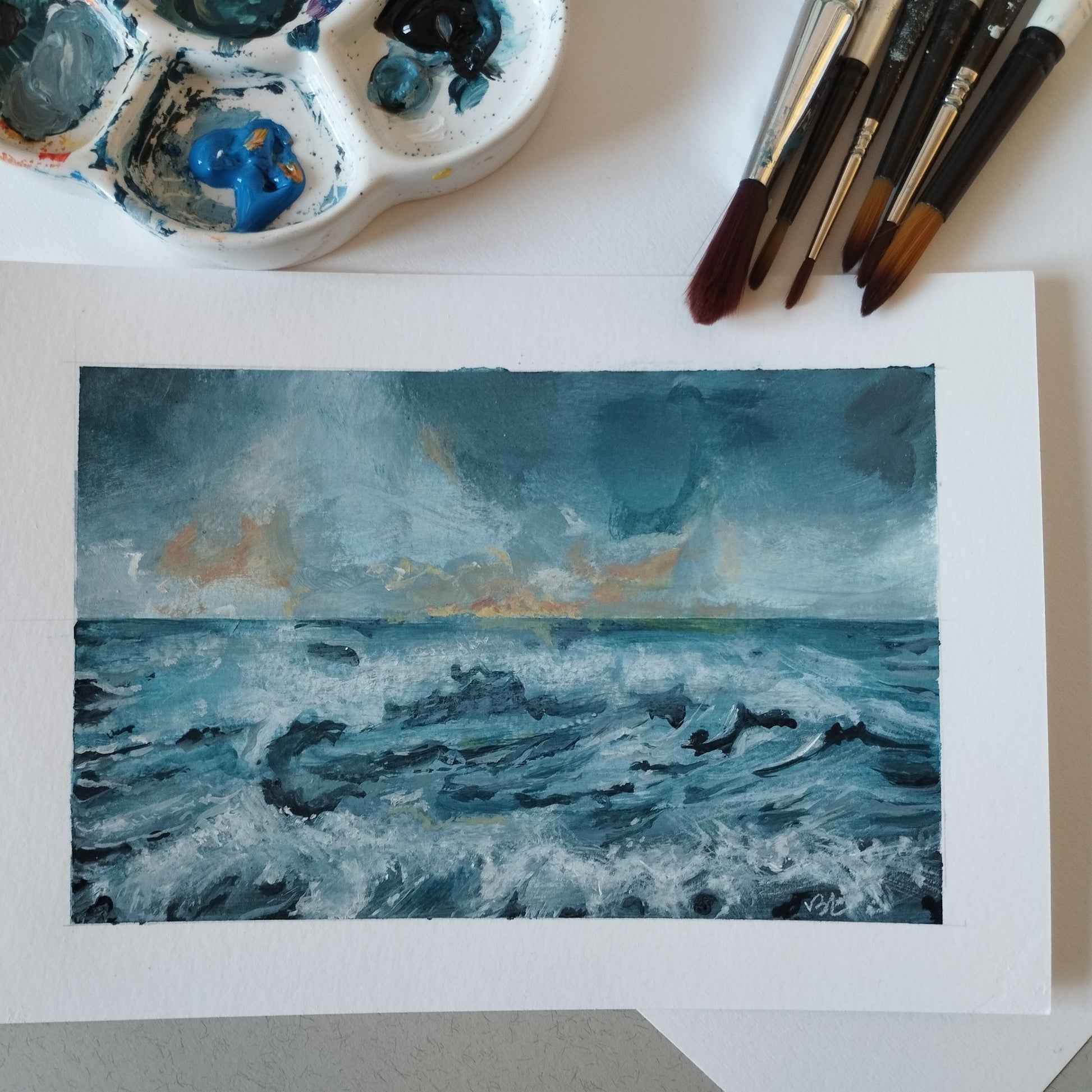 This seascape is an original acrylic artwork painted on watercolor paper 300 g. Sheet size A5 14,5 x 21 cm or 5,8 x 8.3 in, painting size 11 x 17 cm or 4,4 x6.7 in.